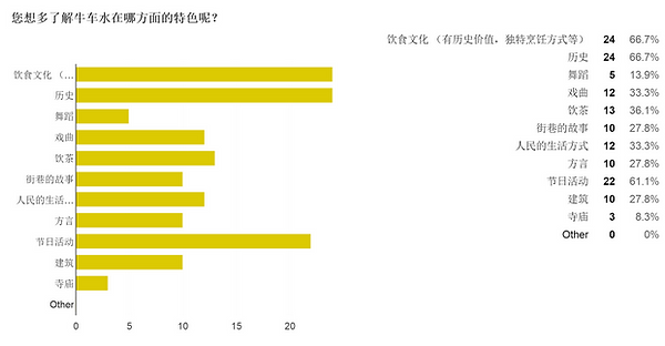 这一题的结果分很多类,大多数的选择结果差不多,没有明显的不同。青少年都觉得自己了解牛车水的不同方面,最多的人觉得自己认识那里的历史和饮食文化。可能是因为现在很难有机会在牛车水观看舞蹈表演了,所以很少人认识牛车水的那个方面。